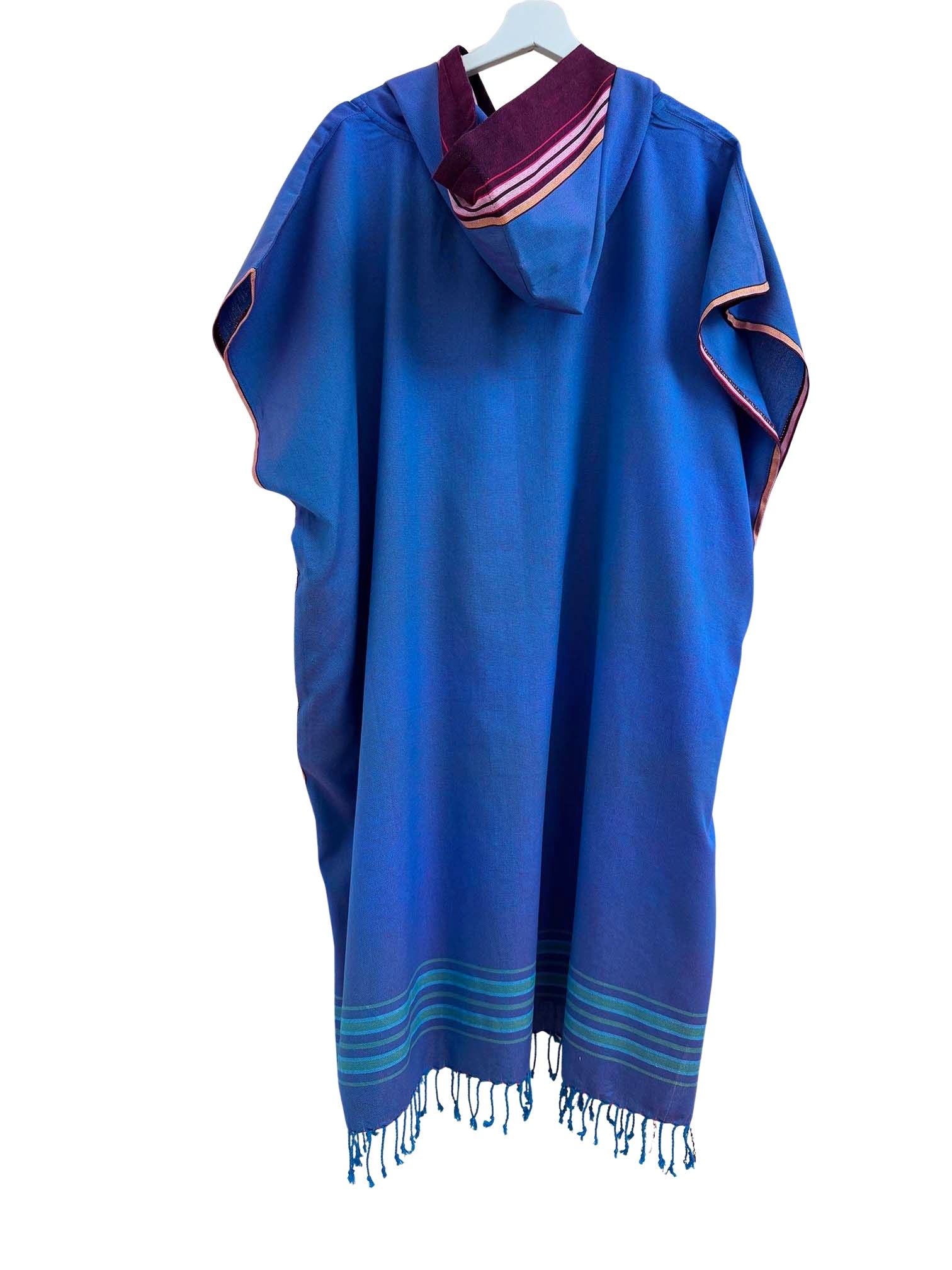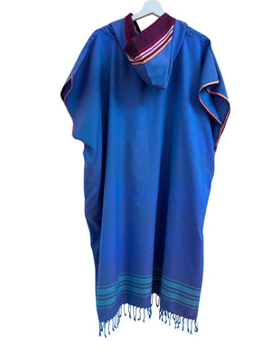 Ein Original Kikoy Poncho aus Kenia ist aus einem traditionellen Kikoi Baumwoll-Tuch gefertigt. Das Kikoi Tuch wird von den Küstenbewohnern Ostafrikas seit Jahrzehnten als Kleidungsstück getragen, und hat handgezwirbelte, verknotete Fransen.